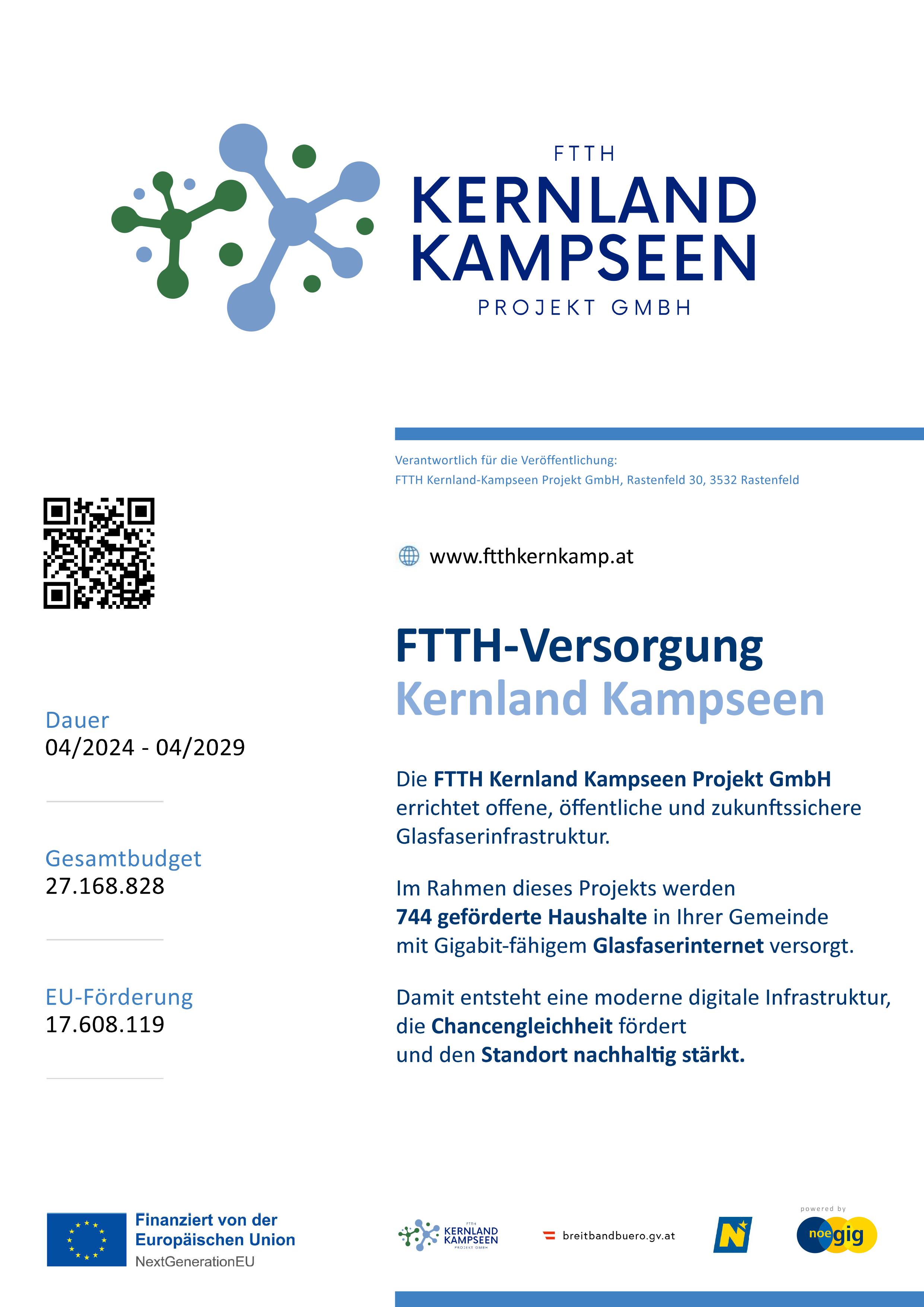 Die FTTH Kernland-Kampseen Projekt GmbH ist ein Zusammenschluss der Gemeinden Albrechtsberg an der Großen Krems, Gföhl, Lichtenau, Jaidhof, Weinzierl am Walde, Sallingberg, Rastenfeld und Großgöttfritz. Unser gemeinsames Ziel: eine flächendeckende Versorgung der Region mit zukunftssicherer Glasfaserinfrastruktur und eine optimale Vorbereitung auf die digitale Zukunft.